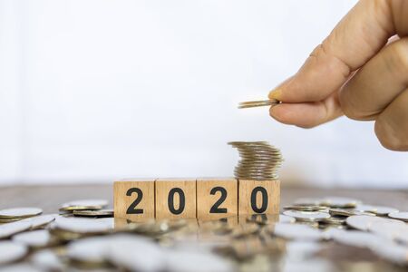 2020 New year and saving concept. Close up of stack of silver coins on number wooden block toy with man hand holding and put coin on top of stack