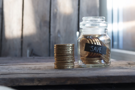 Save idea, gold coins in a glass jar, inscription save and a stack of gold coins