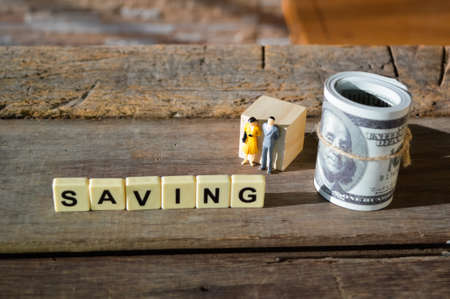 Selective focus of people miniatures, money banknote and square letters with text SAVING.