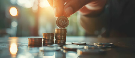 This close-up image showcases a hand carefully stacking coins in a neat tower, symbolizing financial planning and wealth accumulation in a modern setting.