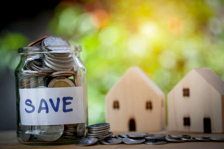 Full coin in a glass jar with house model for show money saving financial concept, home, loan, education in the future isolated on bokeh background.