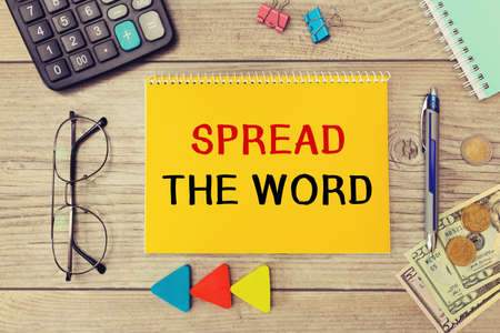 Blank notepad with text SPREAD THE WORD on wooden surface