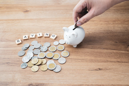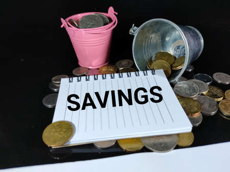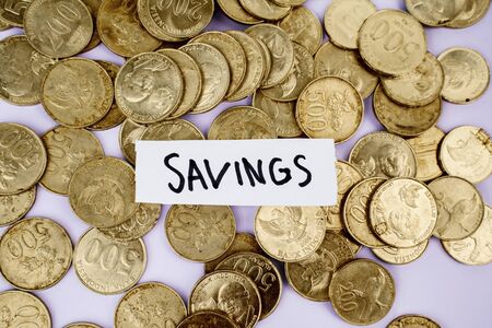 Flat lay of golden coins with Savings text on the able. Savings or Investment concept