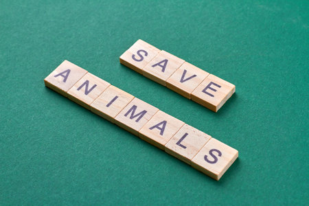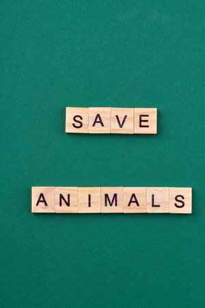 Save animals concept. Words made of wooden blocks isolated on green background.