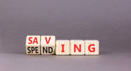 Spending and saving symbol. Concept words Saving to Spending on beautiful wooden cubes. Beautiful gray table gray background. Business, spending and saving concept. Copy space.