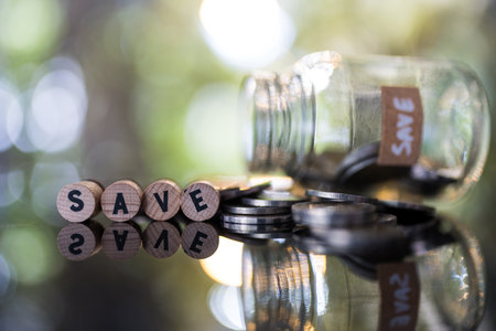 Save word on wooden block and jar full of coins on blurred green natural background. Saving money and investment concept.