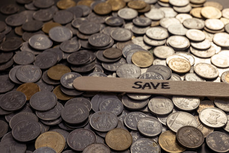 A close-up shot of Indian rupees coins spread on a table. The coins are arranged in a circular pattern, and the word save is written in a stick on the table in front of the coins.