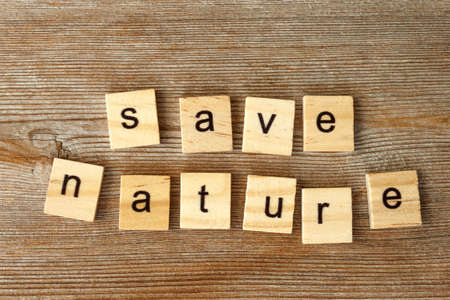 Inscription text word save nature made of letters on wooden blocks on old rustic wood background. Ecology concept. Flat lay. Top view. Close up. Selective soft focus. Text copy space.