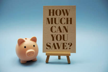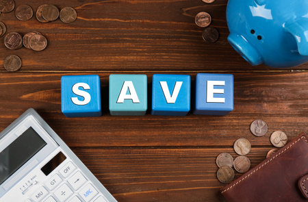 Money bank near, coins and wooden blocks spelling SAVE. Concept showing saving money and financial planning.