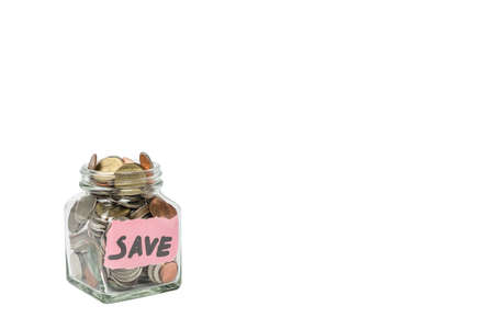 Glass jar of coin with save word isolated on white with copyspace. Photo with clipping path