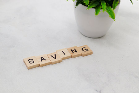 Top view of Saving word on wooden cube letter block on white background. Business concept