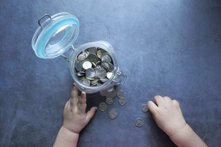 Close up of Little child kid boy hands grabbing and putting stack coins in to glass jar with save label. Donation, saving money, charity, family finance plan concept.