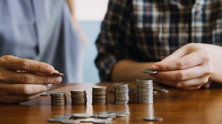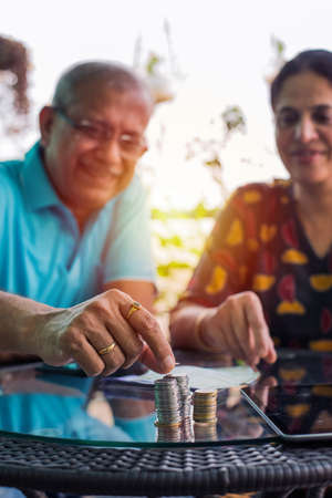 Senior Indian/asian couple arranging/staking coins pile in a row, selective focus