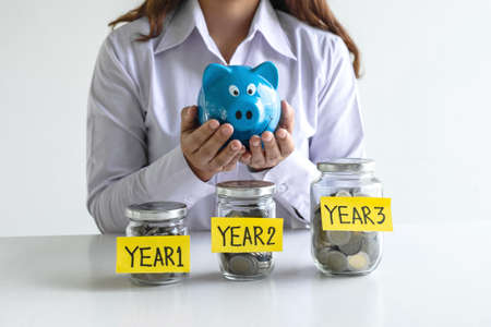 Woman putting coin in blue piggy bank for step up growing business to profit of each years and saving with piggy bank, Saving money for future plan and retirement fund concept.