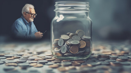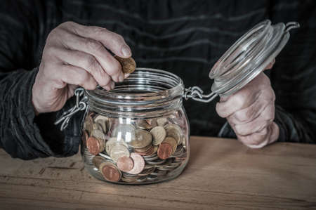 Elderly retired woman and her savings in a jar
