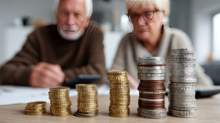 An elderly couple examines their financial situation with stacks of coins laid out on a table in a cozy indoor space, reflecting on their future.