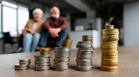 A warm and inviting scene featuring a senior couple enjoying each other's company with stacked coins symbolizing financial planning and savings.