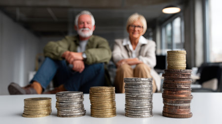 An elderly couple smiles in a modern office environment, surrounded by stacks of coins representing their financial journey and future planning.