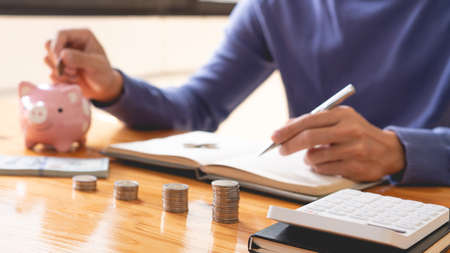 saving concept the man writing down his income and counting some money as a saving-up part on his notebook while dropping a coin into the piggy bank.