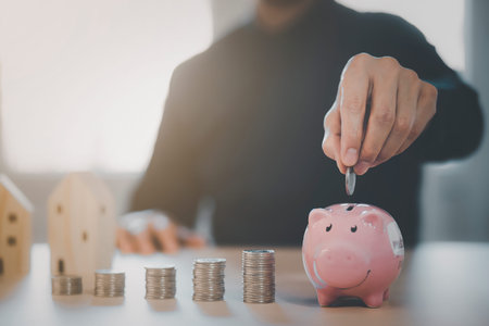 Closeup of man hand putting money coin into piggy bank for saving money. saving money and financial concept