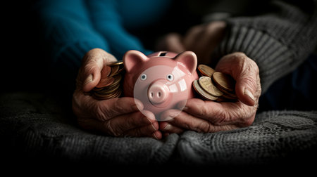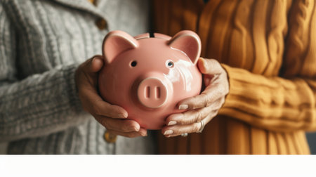 Senior couple holding pink piggy bank, symbolizing retirement savings and financial security.
