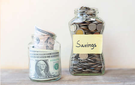 Coins and dollars savings in glass jar filled isolated on vintage wooden table.