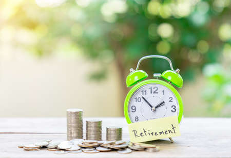 The concept of saving money for retirement. Coin stack, pile of coin and alarm clock on wooden desk.