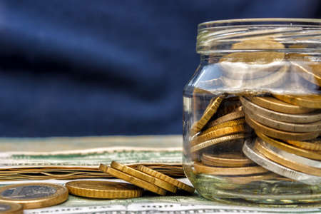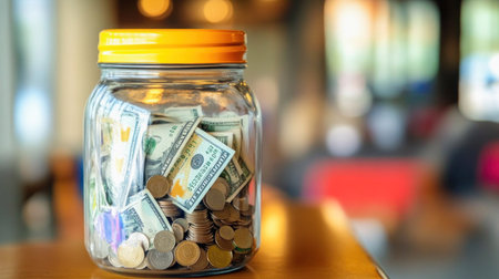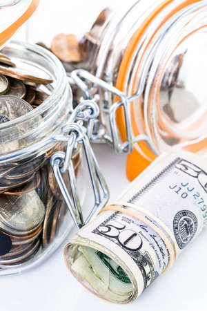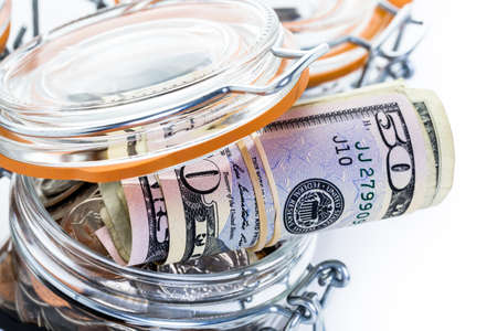 Saving money in a glass jar with us dollar banknotes and coins, suggesting financial planning and investment for future goals