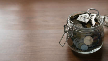 Property and financial concept. Selective focus of a jar full of coins with a key and a house keychain on wooden background with copy space.