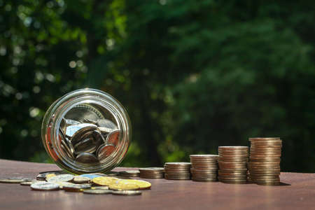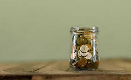 Coins inside a glass jar savings placed on a wooden table represent accumulating wealth and achieving financial goals