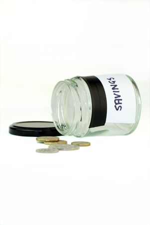 Glass jar fell and metal money crumbled, isolated on white background. Store personal savings. Copy space. Selective focus.