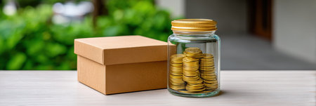 Jar of coins and cardboard box on table suggesting e commerce saving and gift idea