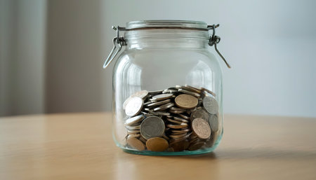 Minimal financial planning visual showing a jar filled with coins under diffused lighting.
