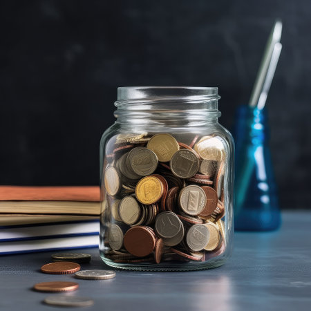 AI Generated. Glass Jar with Stacked Coins and Natural Light