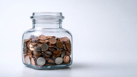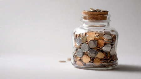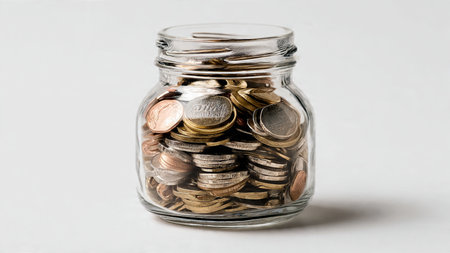 Clean financial theme with a jar and scattered coins forming a balanced composition, commercial-safe.