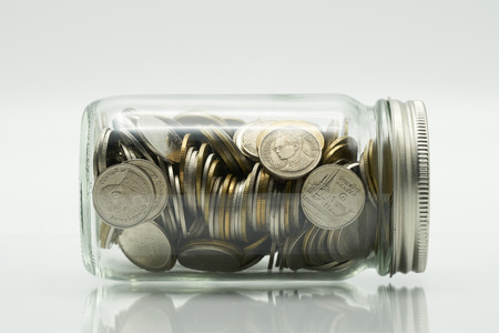 Stock Thai coin (baht) in clear glass jar. Save money or investment financial for future concept.
