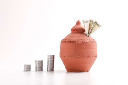 Clay piggy bank pot with five hundred rupees bank note and coin in indian currency on white background