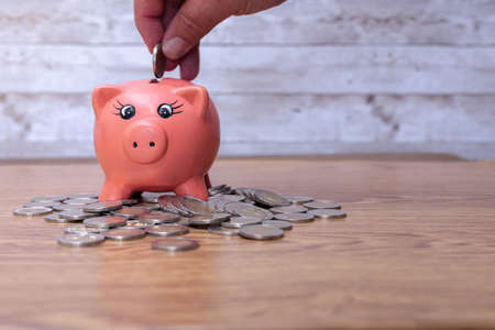 Save money and account banking for finance concept, Hand with coin on piggy bank blurred background