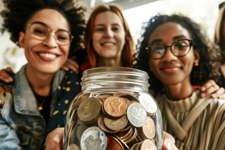 Three friends holding a jar of coins, smiling, and supporting a fundraising or charity event
