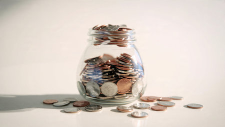 Gentle studio-lit scene showing a tipped glass jar with a neat line of coins spilling out, commercial-safe.