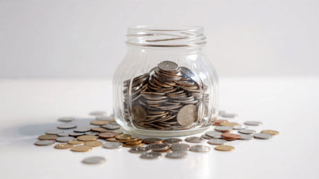 Modern budget visualization with a small glass jar containing mixed coins arranged symmetrically on a white matte surface, commercial-safe.