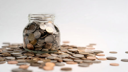 Coins in a clear glass bottle on white background