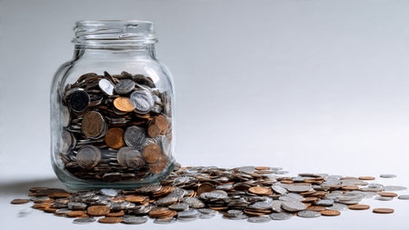 Modern minimal setup showing scattered coins emerging from a tipped transparent jar.