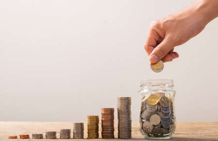Savings money with hand putting a coin. financial concept