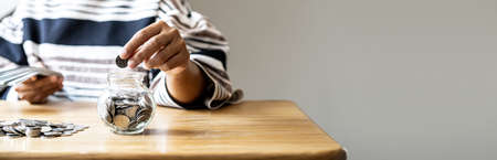 A woman is putting coins in a jar with a lot of coins inside, she is managing to divide her money to save money and invest it to make it grow even more. Concept of saving money and investing. banner background with copy space.