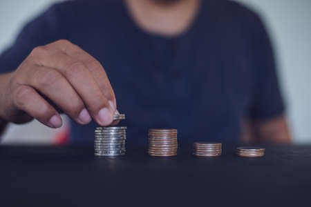 Woman' hand are putting money on stacking coin ,A Money management, saving money and investment concept