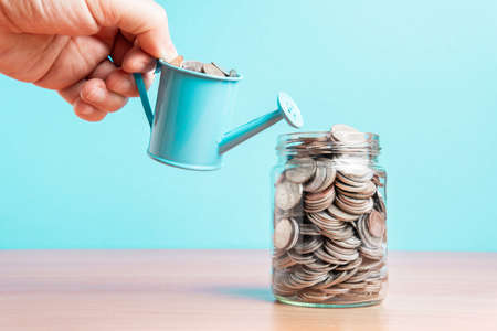 Saving money into glass jar for future investment.