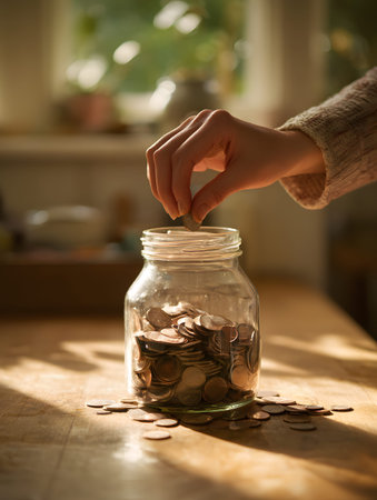 A hand placing coin into glass jar of savings on wooden table in warm sunlight, cozy home budgeting and cash savings habit