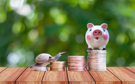 The snail and the piggy bank are on the pile of coins for financial growth ideas.