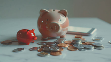 This charming image features a pink piggy bank lying next to scattered coins, set against a vibrant graffiti wall that adds an urban flair.